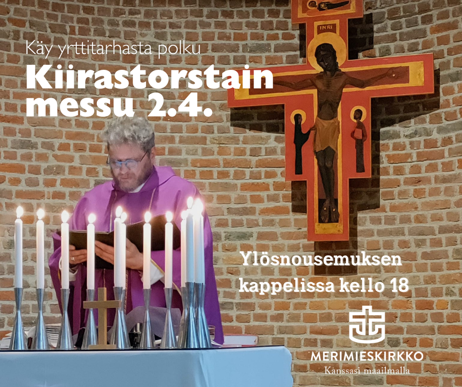 Kiirastorstaina muistellaan Jeesuksen viimeistä ateriaa lähimpien ystäviensä kanssa. Jeesus palvelee seuraajiaan ehtoollispöydässä edelleenkin. Sydämellisesti tervetuloa messuun. Sen toimittaa merimiespastori Jaakko Heinimäki.