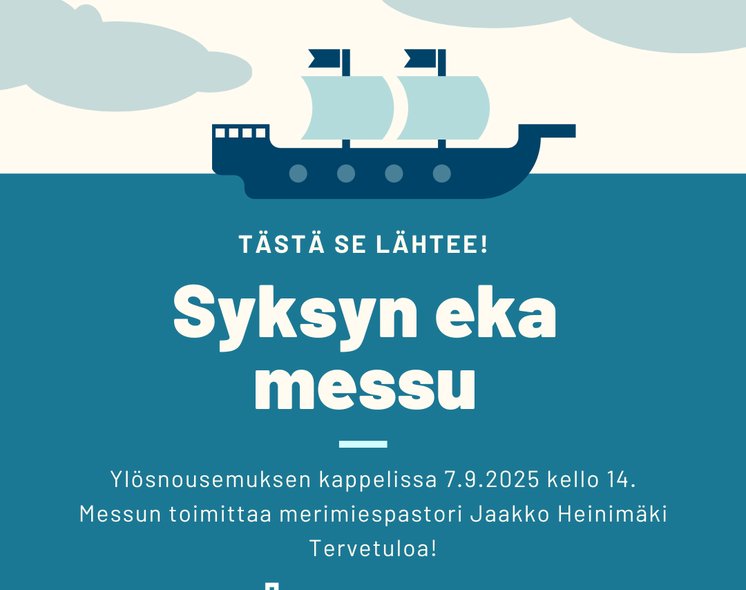 Tervetuloa jumalanpalvelukseen Ylösnousemuksen kappeliin sunnuntaina 7.9. kello 14. Huomaa uusi kellonaika. Koko perheen messun toimittaa merimiespastori Jaakko Heinimäki. Kirkkokahvit ja -mehut messun jälkeen merimieskirkolla.