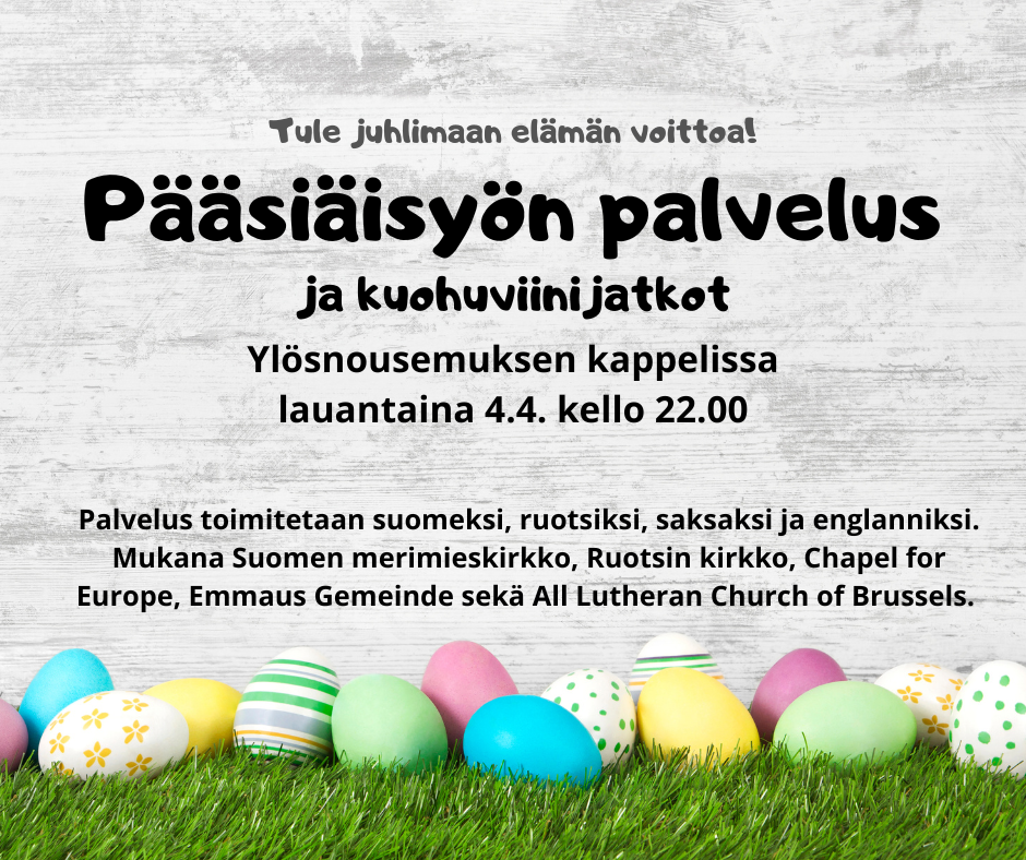 Jumalanpalveluksen jälkeen on tarjolla kuohuviiniä ja pientä purtavaa kappelin aulassa. Lämpimästi tervetuloa juhlimaan elämän voittamista!